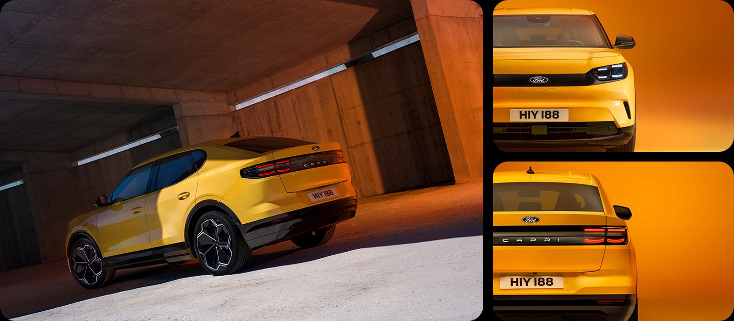 Photo grid of the new Ford Capri® design. Close-ups show the Ford badge on the front and rear, plus CAPRI lettering.